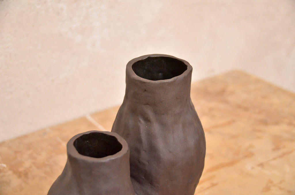 One off, original, textured by hand, this character piece has two openings and may be used as a functional vessel. A symbol of integrity, the duality of pulling forces highlight equilibrium and harmony.