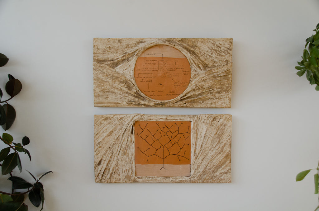 A portal into John’s mind framed by the circle and square, our collaboration took shape as a true exchange. After reading a book I saw in John’s studio (God by Reza Aslan, a Persian American author), rooted in themes of ancient wisdom and the history of humans’ belief in god. The circular shapes then came to me in a meditative vision, and I experimented with linen textiles and clay to create empty holdings for John’s text-based work. A first for me incorporating these materials, it was a new and enjoyable process in forming texture. In response to prompts left in the circles, John introduced his work with copper paint accents.