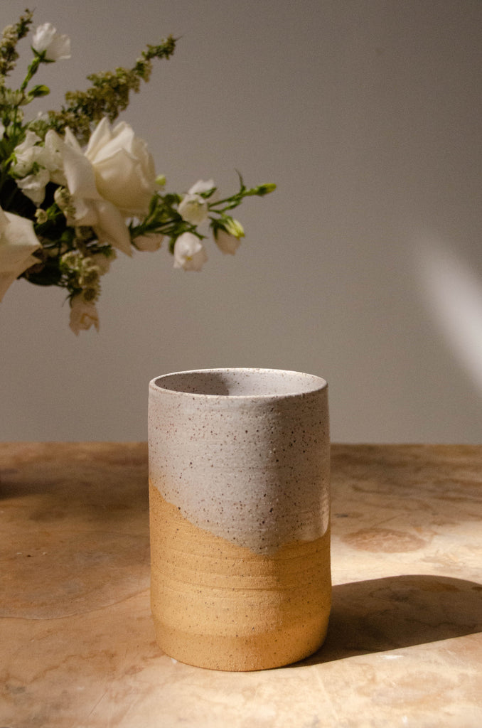Unique speckle textured ceramic vase with white glaze interior and drip.